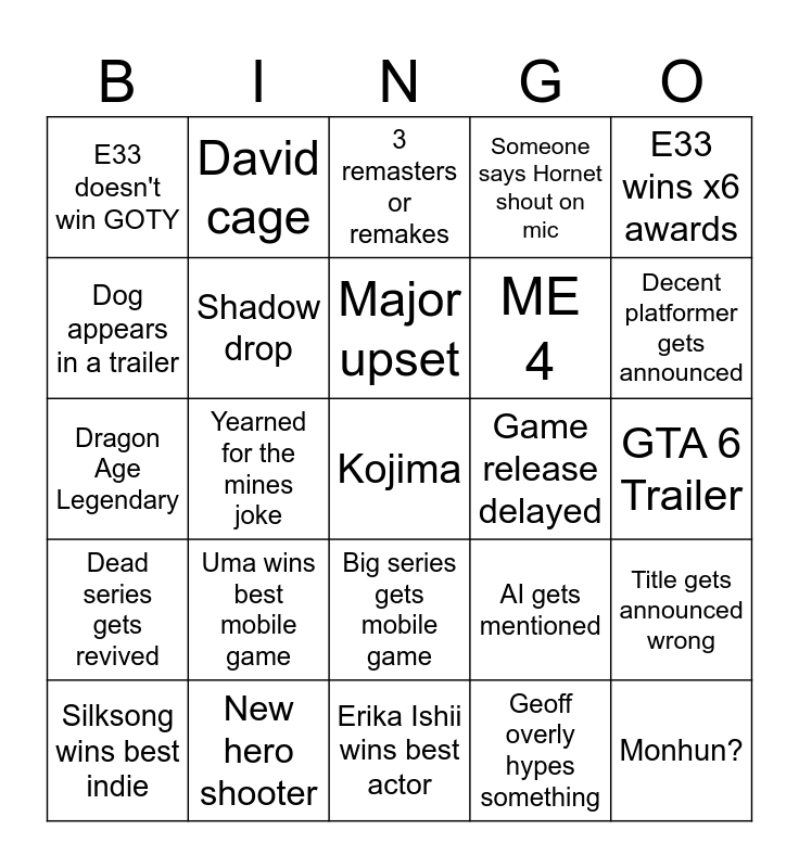 This bingo card has a free space and 24 words: Uma wins best mobile game, New hero shooter, Major upset, Silksong wins best indie, E33 wins x6 awards, E33 doesn't win GOTY, Dog appears in a trailer, David cage, Game release delayed, Big series gets mobile game, ME 4, Dragon Age Legendary, AI gets mentioned, Title gets announced wrong, Shadow drop, Geoff overly hypes something, GTA 6 Trailer, 3 remasters or remakes, Decent platformer gets announced, Yearned for the mines joke, Monhun?, Dead series gets revived, Someone says Hornet shout on mic and Erika Ishii wins best actor.