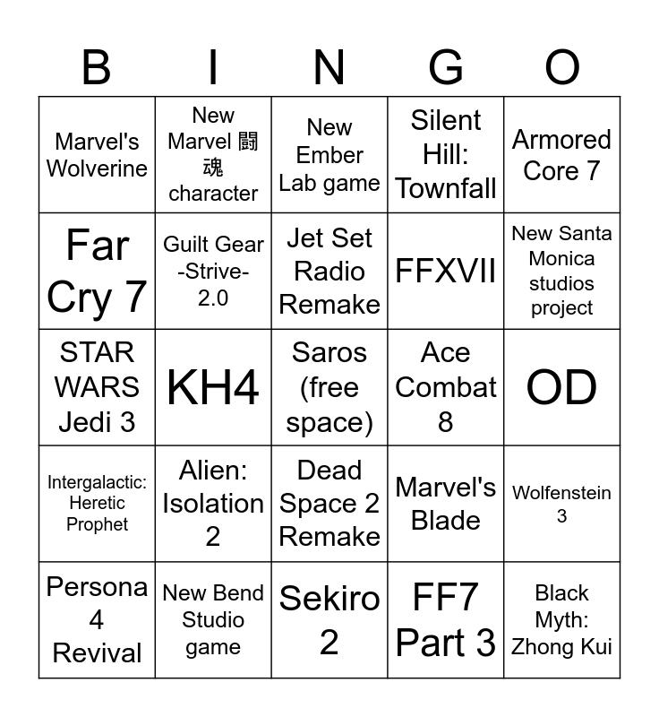 This bingo card has a free space and 24 words: Alien: Isolation 2, New Bend Studio game, Jet Set Radio Remake, Persona 4 Revival, Armored Core 7, Marvel's Wolverine, Far Cry 7, New Marvel 闘魂 character, Ace Combat 8, Dead Space 2 Remake, FFXVII, STAR WARS Jedi 3, Marvel's Blade, Wolfenstein 3, Guilt Gear -Strive- 2.0, FF7 Part 3, OD, New Ember Lab game, New Santa Monica studios project, KH4, Black Myth: Zhong Kui, Intergalactic: Heretic Prophet, Silent Hill: Townfall and Sekiro 2.