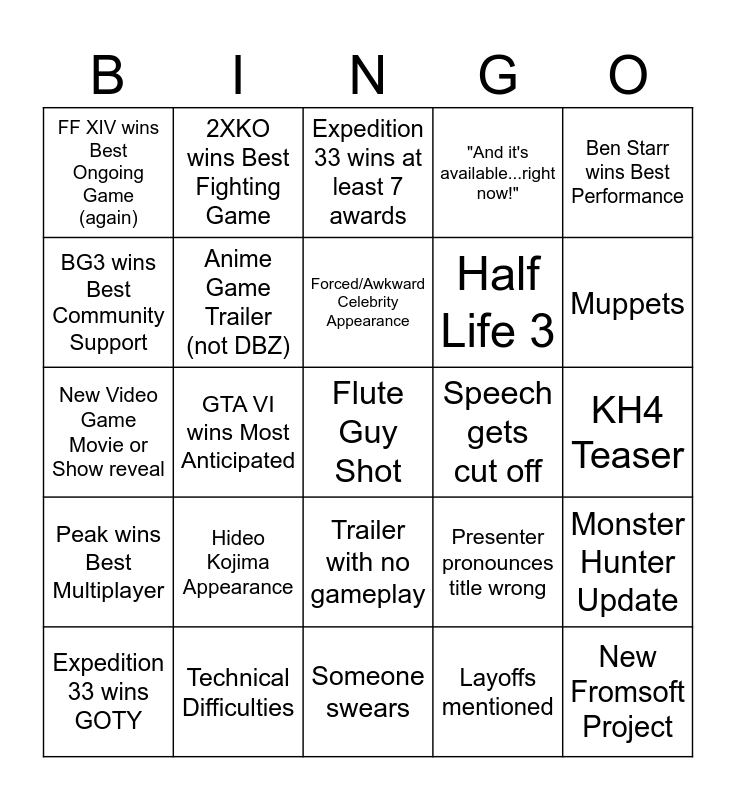 This bingo card has a free space and 24 words: Hideo Kojima Appearance, Technical Difficulties, Forced/Awkward Celebrity Appearance, Expedition 33 wins GOTY, Ben Starr wins Best Performance, FF XIV wins Best Ongoing Game (again), BG3 wins Best Community Support, 2XKO wins Best Fighting Game, Speech gets cut off, Trailer with no gameplay, Half Life 3, New Video Game Movie or Show reveal, Presenter pronounces title wrong, Monster Hunter Update, Anime Game Trailer (not DBZ), Layoffs mentioned, KH4 Teaser, Expedition 33 wins at least 7 awards, Muppets, GTA VI wins Most Anticipated, New Fromsoft Project, Peak wins Best Multiplayer, "And it's available...right now!" and Someone swears.