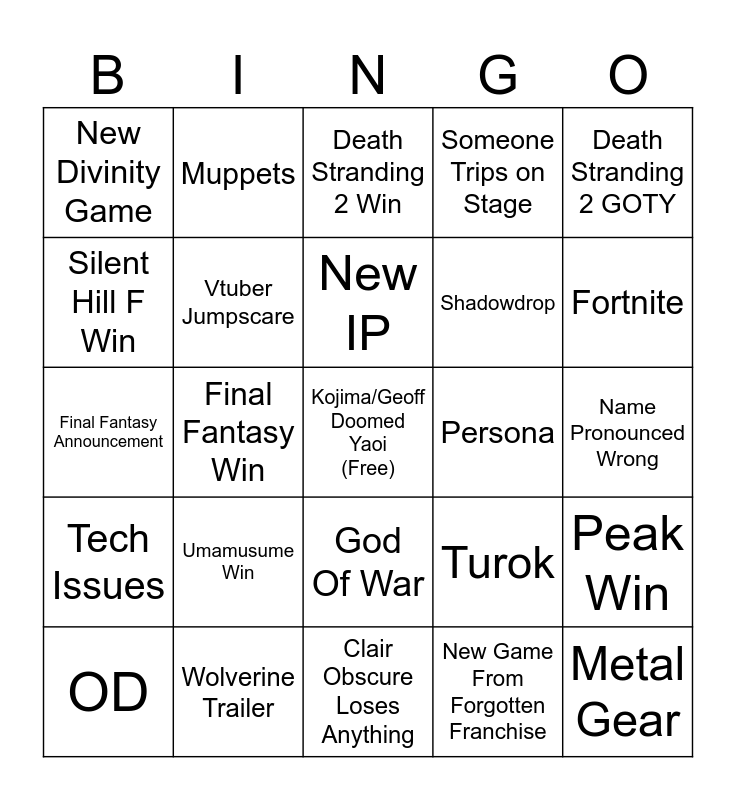 This bingo card has a free space and 24 words: Umamusume Win, Wolverine Trailer, New IP, OD, Death Stranding 2 GOTY, New Divinity Game, Silent Hill F Win, Muppets, Persona, God Of War, Shadowdrop, Final Fantasy Announcement, Turok, Peak Win, Vtuber Jumpscare, New Game From Forgotten Franchise, Name Pronounced Wrong, Death Stranding 2 Win, Fortnite, Final Fantasy Win, Metal Gear, Tech Issues, Someone Trips on Stage and Clair Obscure Loses Anything.