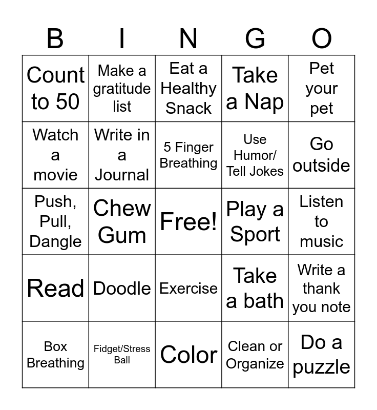 This bingo card has a free space and 29 words: Box Breathing, 5 Senses, Chew Gum, Talk to a Friend, Count to 50, Eat a Healthy Snack, Write in a Journal, Doodle, Play a Sport, Fidget/Stress Ball, Listen to music, Do a puzzle, Color, Clean or Organize, Go outside, Take a Walk, Exercise, Read, Pet your pet, Push, Pull, Dangle, Take a bath, Yoga, Use Humor/ Tell Jokes, Watch a movie, Take a Nap, Make a gratitude list, Write a thank you note, 5 Finger Breathing and Play an instrument.