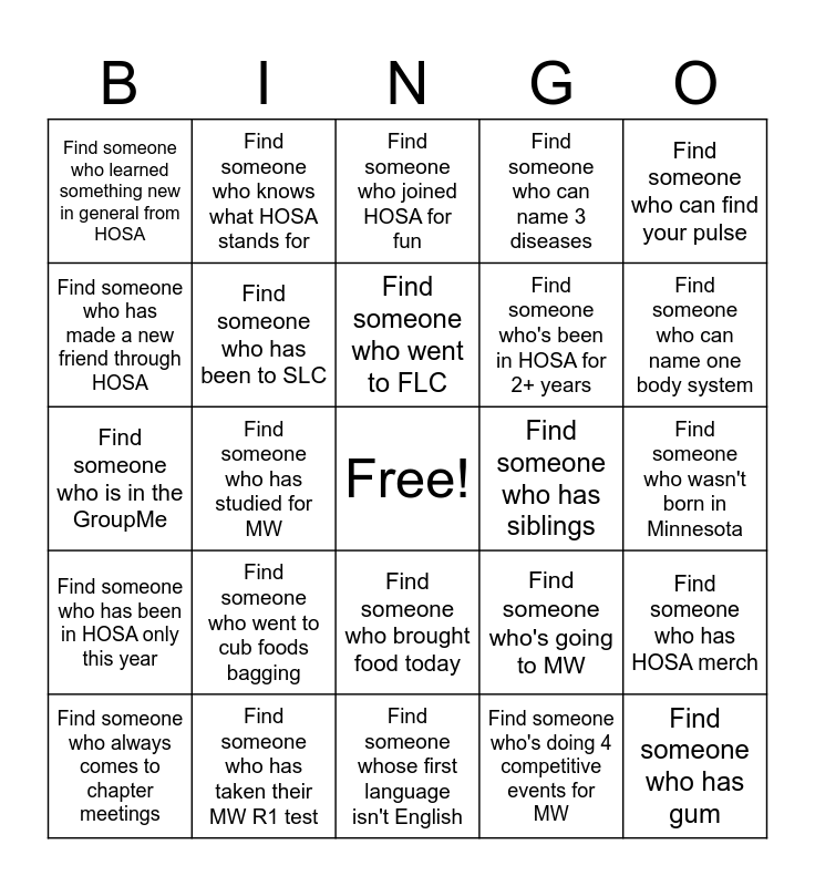 This bingo card has a free space and 24 words: Find someone who went to cub foods bagging, Find someone who has taken their MW R1 test, Find someone who went to FLC, Find someone who always comes to chapter meetings, Find someone who can find your pulse, Find someone who learned something new in general from HOSA, Find someone who has made a new friend through HOSA, Find someone who knows what HOSA stands for, Find someone who has siblings, Find someone who brought food today, Find someone who's been in HOSA for 2+ years, Find someone who is in the GroupMe, Find someone who's going to MW, Find someone who has HOSA merch, Find someone who has been to SLC, Find someone who's doing 4 competitive events for MW, Find someone who wasn't born in Minnesota, Find someone who joined HOSA for fun, Find someone who can name one body system, Find someone who has studied for MW, Find someone who has gum, Find someone who has been in HOSA only this year, Find someone who can name 3 diseases and Find someone whose first language isn't English.