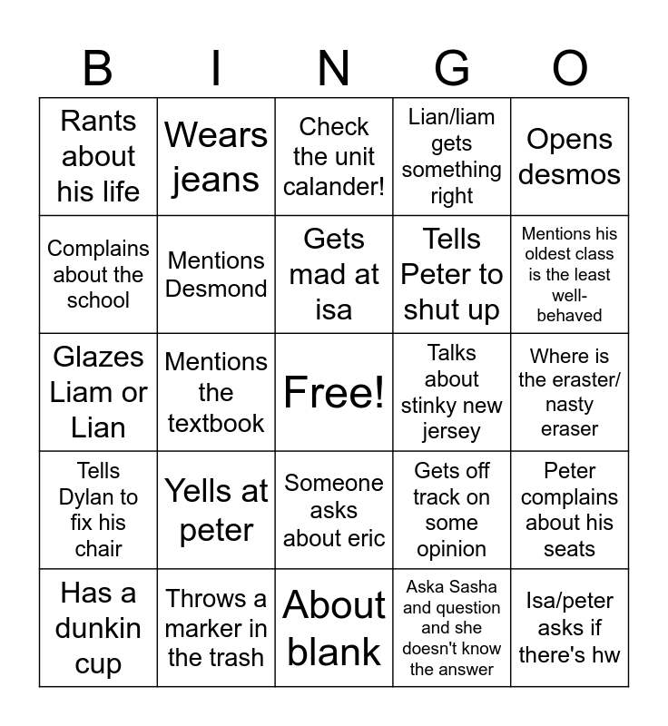 This bingo card has a free space and 24 words: Has a dunkin cup, Yells at peter, Gets mad at isa, Aska Sasha and question and she doesn't know the answer, Opens desmos, Rants about his life, Wears jeans, Check the unit calander!, Talks about stinky new jersey, Where is the eraster/ nasty eraser, Glazes Liam or Lian, Mentions Desmond, Gets off track on some opinion, Peter complains about his seats, Complains about the school, Throws a marker in the trash, About blank, Lian/liam gets something right, Mentions his oldest class is the least well-behaved, Tells Dylan to fix his chair, Mentions the textbook, Someone asks about eric, Tells Peter to shut up and Isa/peter asks if there's hw.