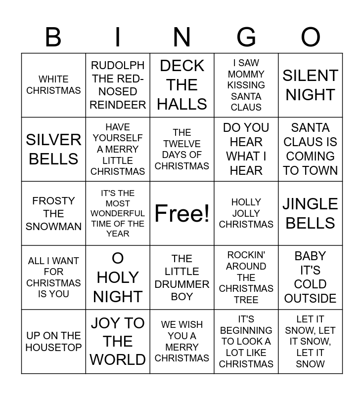 This bingo card has a free space and 24 words: O HOLY NIGHT, JOY TO THE WORLD, THE TWELVE DAYS OF CHRISTMAS, UP ON THE HOUSETOP, SILENT NIGHT, WHITE CHRISTMAS, SILVER BELLS, RUDOLPH THE RED-NOSED REINDEER, HOLLY JOLLY CHRISTMAS, THE LITTLE DRUMMER BOY, DO YOU HEAR WHAT I HEAR, FROSTY THE SNOWMAN, ROCKIN' AROUND THE CHRISTMAS TREE, BABY IT'S COLD OUTSIDE, HAVE YOURSELF A MERRY LITTLE CHRISTMAS, IT'S BEGINNING TO LOOK A LOT LIKE CHRISTMAS, JINGLE BELLS, DECK THE HALLS, SANTA CLAUS IS COMING TO TOWN, IT'S THE MOST WONDERFUL TIME OF THE YEAR, LET IT SNOW, LET IT SNOW, LET IT SNOW, ALL I WANT FOR CHRISTMAS IS YOU, I SAW MOMMY KISSING SANTA CLAUS and WE WISH YOU A MERRY CHRISTMAS.