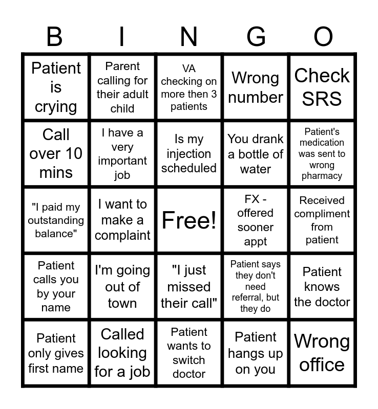 This bingo card has a free space and 37 words: Thanks for nothing, Is my MRI scheduled?, I think I missed a call, I have a very important job, Patient knows the doctor, I'm going out of town, Is my injection scheduled, "That's too early", Check SRS, "I want to speak with a manager", I want to make a complaint, Wrong number, Wrong office, Received compliment from patient, Call over 10 mins, Patient calls you by your name, Patient called yesterday, VA checking on more then 3 patients, "I just missed their call", FX - offered sooner appt, Patient is crying, Patient's medication was sent to wrong pharmacy, Patient only gives first name, Patient wants to switch doctor, Patient gets mad when they can't speak to doctor or nurse, Patient hangs up on you, Parent calling for their adult child, Patient upset with wait time, Patient cancels day of appt, Patient left message yesterday and has not received callback, Patient tells you their life story, Called looking for a job, "I paid my outstanding balance", Patient went to wrong office, Patient says they don't need referral, but they do, You drank a bottle of water and Caller is a dentist office.