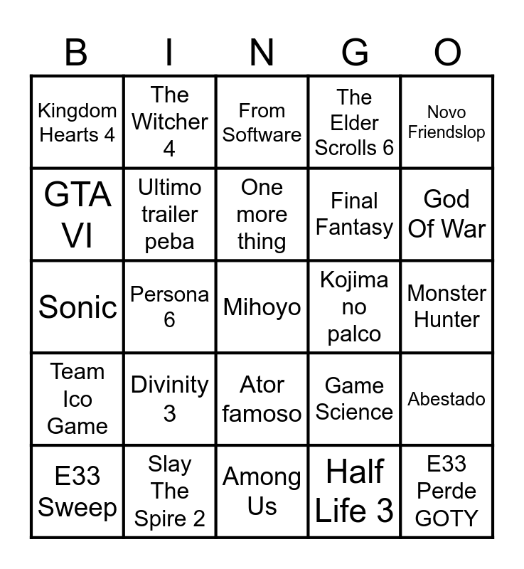 This bingo card has a free space and 24 words: Divinity 3, Slay The Spire 2, One more thing, E33 Sweep, Novo Friendslop, Kingdom Hearts 4, GTA VI, The Witcher 4, Kojima no palco, Ator famoso, Final Fantasy, Sonic, Game Science, Abestado, Ultimo trailer peba, Half Life 3, Monster Hunter, From Software, God Of War, Persona 6, E33 Perde GOTY, Team Ico Game, The Elder Scrolls 6 and Among Us.