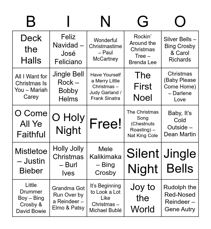 This bingo card has a free space and 50 words: Frosty the Snowman – Jimmy Durante, Rudolph the Red-Nosed Reindeer – Gene Autry, Santa Claus Is Comin’ to Town – Jackson 5 / Bruce Springsteen, It’s Beginning to Look a Lot Like Christmas – Michael Bublé, Holly Jolly Christmas – Burl Ives, Sleigh Ride – The Ronettes, Feliz Navidad – José Feliciano, Winter Wonderland, All I Want for Christmas Is You – Mariah Carey, Last Christmas – Wham!, Jingle Bell Rock – Bobby Helms, Rockin’ Around the Christmas Tree – Brenda Lee, Jingle Bells, Silent Night, White Christmas – Bing Crosby, Let It Snow! Let It Snow! Let It Snow! – Dean Martin, Have Yourself a Merry Little Christmas – Judy Garland / Frank Sinatra, The Christmas Song (Chestnuts Roasting) – Nat King Cole, Blue Christmas – Elvis Presley, Silver Bells – Bing Crosby & Carol Richards, O Holy Night, Joy to the World, Deck the Halls, The First Noel, Hark! The Herald Angels Sing, Mary, Did You Know? – Pentatonix, Christmas (Baby Please Come Home) – Darlene Love, Happy Xmas (War Is Over) – John Lennon, Wonderful Christmastime – Paul McCartney, Mele Kalikimaka – Bing Crosby, I’ll Be Home for Christmas – Bing Crosby, Here Comes Santa Claus – Gene Autry, Up on the Housetop, Little Saint Nick – The Beach Boys, Grandma Got Run Over by a Reindeer – Elmo & Patsy, Silver and Gold – Burl Ives, Christmas Time Is Here – Vince Guaraldi, It's the Most Wonderful Time of the Year – Andy Williams, Run Rudolph Run – Chuck Berry, Baby, It’s Cold Outside – Dean Martin, Christmas Wrapping – The Waitresses, Underneath the Tree – Kelly Clarkson, We Wish You a Merry Christmas, Carol of the Bells – Trans-Siberian Orchestra, Little Drummer Boy – Bing Crosby & David Bowie, O Come All Ye Faithful, I Saw Mommy Kissing Santa Claus – The Jackson 5, Do You Hear What I Hear? – Whitney Houston / Bing Crosby, Mistletoe – Justin Bieber and Believe – Josh Groban.