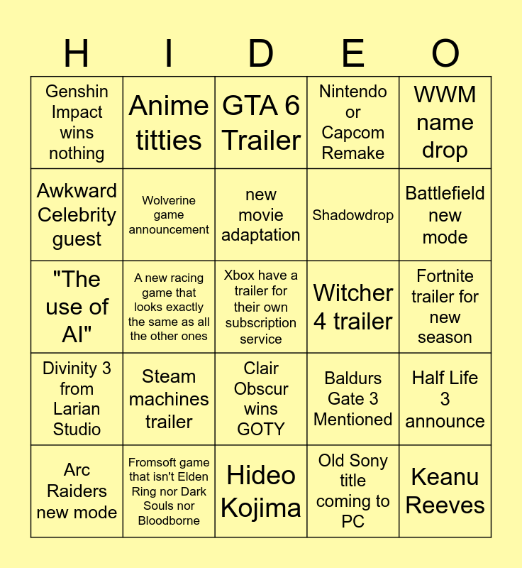 This bingo card has 25 words: Divinity 3 from Larian Studio, Fromsoft game that isn't Elden Ring nor Dark Souls nor Bloodborne, Xbox have a trailer for their own subscription service, Old Sony title coming to PC, WWM name drop, Genshin Impact wins nothing, Anime titties, GTA 6 Trailer, Witcher 4 trailer, Half Life 3 announce, Awkward Celebrity guest, Wolverine game announcement, Hideo Kojima, Baldurs Gate 3 Mentioned, Battlefield new mode, Arc Raiders new mode, A new racing game that looks exactly the same as all the other ones, new movie adaptation, Shadowdrop, Fortnite trailer for new season, "The use of AI", Steam machines trailer, Clair Obscur wins GOTY, Nintendo or Capcom Remake and Keanu Reeves.