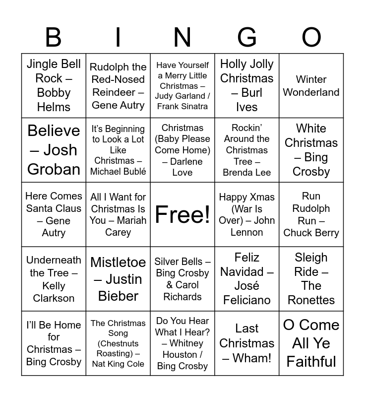 This bingo card has a free space and 50 words: Little Drummer Boy – Bing Crosby & David Bowie, O Come All Ye Faithful, I Saw Mommy Kissing Santa Claus – The Jackson 5, Do You Hear What I Hear? – Whitney Houston / Bing Crosby, Mistletoe – Justin Bieber, Frosty the Snowman – Jimmy Durante, Rudolph the Red-Nosed Reindeer – Gene Autry, Carol of the Bells – Trans-Siberian Orchestra, Believe – Josh Groban, Santa Claus Is Comin’ to Town – Jackson 5 / Bruce Springsteen, It’s Beginning to Look a Lot Like Christmas – Michael Bublé, Holly Jolly Christmas – Burl Ives, Sleigh Ride – The Ronettes, Feliz Navidad – José Feliciano, Hark! The Herald Angels Sing, Mary, Did You Know? – Pentatonix, Christmas (Baby Please Come Home) – Darlene Love, Happy Xmas (War Is Over) – John Lennon, Wonderful Christmastime – Paul McCartney, Winter Wonderland, All I Want for Christmas Is You – Mariah Carey, Last Christmas – Wham!, Jingle Bell Rock – Bobby Helms, Rockin’ Around the Christmas Tree – Brenda Lee, Jingle Bells, Silent Night, White Christmas – Bing Crosby, Let It Snow! Let It Snow! Let It Snow! – Dean Martin, Have Yourself a Merry Little Christmas – Judy Garland / Frank Sinatra, Silver Bells – Bing Crosby & Carol Richards, O Holy Night, Joy to the World, Deck the Halls, The First Noel, The Christmas Song (Chestnuts Roasting) – Nat King Cole, Blue Christmas – Elvis Presley, Mele Kalikimaka – Bing Crosby, Christmas Time Is Here – Vince Guaraldi, It's the Most Wonderful Time of the Year – Andy Williams, Run Rudolph Run – Chuck Berry, Up on the Housetop, Little Saint Nick – The Beach Boys, Grandma Got Run Over by a Reindeer – Elmo & Patsy, Baby, It’s Cold Outside – Dean Martin, I’ll Be Home for Christmas – Bing Crosby, Here Comes Santa Claus – Gene Autry, Silver and Gold – Burl Ives, Christmas Wrapping – The Waitresses, Underneath the Tree – Kelly Clarkson and We Wish You a Merry Christmas.