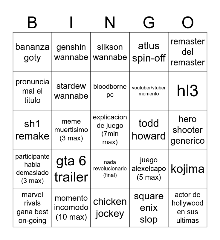 This bingo card has a free space and 24 words: gta 6 trailer, momento incomodo (10 max), bloodborne pc, marvel rivals gana best on-going, remaster del remaster, bananza goty, pronuncia mal el titulo, genshin wannabe, todd howard, nada revolucionario (final), youtuber/vtuber momento, sh1 remake, juego alexelcapo (5 max), kojima, stardew wannabe, square enix slop, hero shooter generico, silkson wannabe, hl3, meme muertisimo (3 max), actor de hollywood en sus ultimas, participante habla demasiado (3 max), atlus spin-off and chicken jockey.