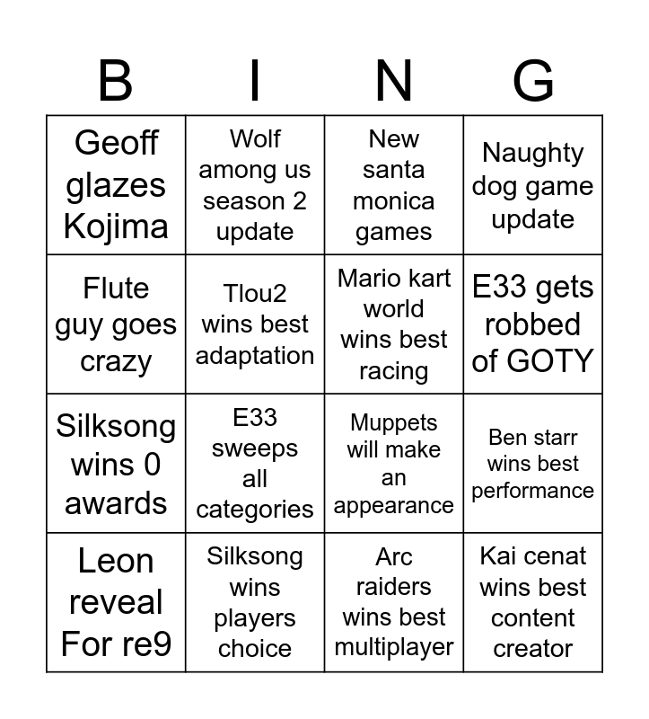This bingo card has 16 words: Leon reveal For re9, Silksong wins players choice, New santa monica games, Naughty dog game update, Flute guy goes crazy, Wolf among us season 2 update, Muppets will make an appearance, Ben starr wins best performance, Geoff glazes Kojima, Tlou2 wins best adaptation, Arc raiders wins best multiplayer, E33 gets robbed of GOTY, Silksong wins 0 awards, E33 sweeps all categories, Mario kart world wins best racing and Kai cenat wins best content creator.