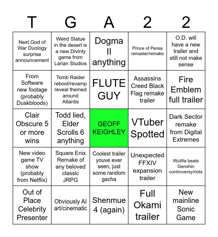 This bingo card has a free space and 24 words: Square Enix Remake of any beloved classic JRPG, Obviously AI art/cinematic, FLUTE GUY, Out of Place Celebrity Presenter, O.D. will have a new trailer and still not make sense, Next God of War Duology surprise announcement, From Software new footage (probably Duskbloods), Weird Statue in the desert is a new Divinty game from Larian Studios, VTuber Spotted, Coolest trailer youve ever seen, just some random gacha, Assassins Creed Black Flag remake trailer, Clair Obscure 5 or more wins, Unexpected FFXIV expansion trailer, WuWa beats Genshin controversy/riots, Tomb Raider reboot/revamp reveal themed around Atlantis, Full Okami trailer, Dark Sector remake from Digital Extremes, Dogma II anything, Fire Emblem full trailer, Todd lied, Elder Scrolls 6 anything, New mainline Sonic Game, New video game TV show (probably from Netflix), Prince of Persia remaster/remake and Shenmue 4 (again).