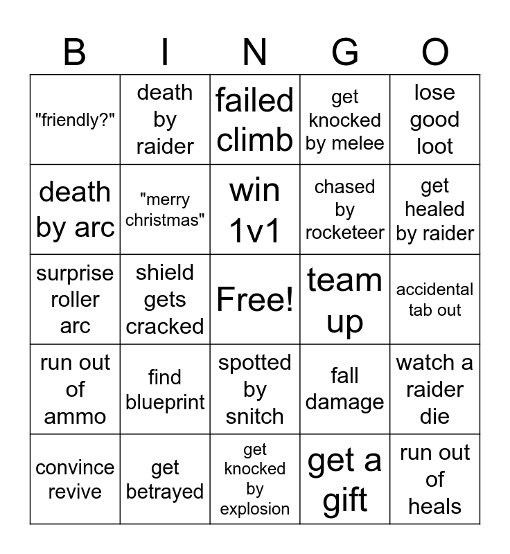 This bingo card has a free space and 24 words: find blueprint, get betrayed, win 1v1, convince revive, lose good loot, "friendly?", death by arc, death by raider, team up, spotted by snitch, chased by rocketeer, surprise roller arc, fall damage, watch a raider die, "merry christmas", get a gift, accidental tab out, failed climb, get healed by raider, shield gets cracked, run out of heals, run out of ammo, get knocked by melee and get knocked by explosion.