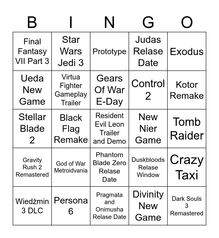 This bingo card has a free space and 24 words: God of War Metroidvania, Persona 6, Gears Of War E-Day, Wiedżmin 3 DLC, Exodus, Final Fantasy VII Part 3, Ueda New Game, Star Wars Jedi 3, New Nier Game, Phantom Blade Zero Relase Date, Control 2, Stellar Blade 2, Duskbloods Relase Window, Crazy Taxi, Virtua Fighter Gameplay Trailer, Divinity New Game, Tomb Raider, Prototype, Kotor Remake, Black Flag Remake, Dark Souls 3 Remastered, Gravity Rush 2 Remastered, Judas Relase Date and Pragmata and Onimusha Relase Date.
