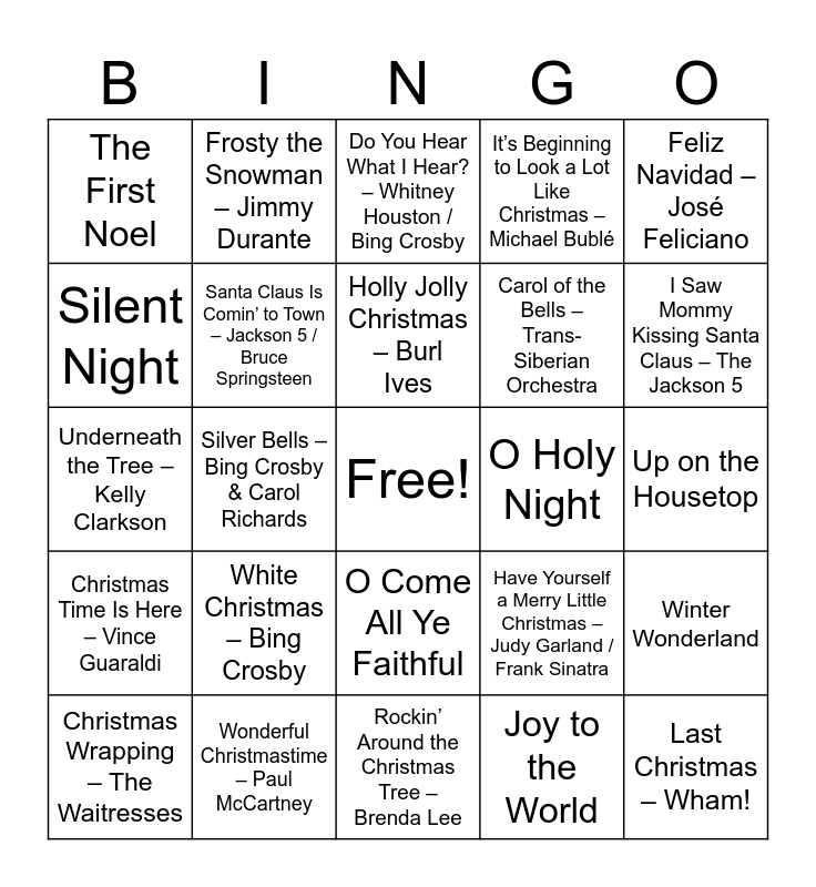 This bingo card has a free space and 50 words: All I Want for Christmas Is You – Mariah Carey, Last Christmas – Wham!, Jingle Bell Rock – Bobby Helms, Rockin’ Around the Christmas Tree – Brenda Lee, White Christmas – Bing Crosby, Let It Snow! Let It Snow! Let It Snow! – Dean Martin, Frosty the Snowman – Jimmy Durante, Jingle Bells, Silent Night, Rudolph the Red-Nosed Reindeer – Gene Autry, Santa Claus Is Comin’ to Town – Jackson 5 / Bruce Springsteen, It’s Beginning to Look a Lot Like Christmas – Michael Bublé, Winter Wonderland, Have Yourself a Merry Little Christmas – Judy Garland / Frank Sinatra, The Christmas Song (Chestnuts Roasting) – Nat King Cole, Blue Christmas – Elvis Presley, Holly Jolly Christmas – Burl Ives, O Holy Night, Sleigh Ride – The Ronettes, Feliz Navidad – José Feliciano, Silver Bells – Bing Crosby & Carol Richards, Joy to the World, The First Noel, Carol of the Bells – Trans-Siberian Orchestra, Little Drummer Boy – Bing Crosby & David Bowie, We Wish You a Merry Christmas, I Saw Mommy Kissing Santa Claus – The Jackson 5, Hark! The Herald Angels Sing, Do You Hear What I Hear? – Whitney Houston / Bing Crosby, O Come All Ye Faithful, Mary, Did You Know? – Pentatonix, Christmas (Baby Please Come Home) – Darlene Love, Deck the Halls, Happy Xmas (War Is Over) – John Lennon, Wonderful Christmastime – Paul McCartney, Mele Kalikimaka – Bing Crosby, Little Saint Nick – The Beach Boys, I’ll Be Home for Christmas – Bing Crosby, Here Comes Santa Claus – Gene Autry, Up on the Housetop, Grandma Got Run Over by a Reindeer – Elmo & Patsy, Run Rudolph Run – Chuck Berry, Baby, It’s Cold Outside – Dean Martin, Silver and Gold – Burl Ives, Christmas Wrapping – The Waitresses, Underneath the Tree – Kelly Clarkson, Mistletoe – Justin Bieber, Believe – Josh Groban, Christmas Time Is Here – Vince Guaraldi and It's the Most Wonderful Time of the Year – Andy Williams.