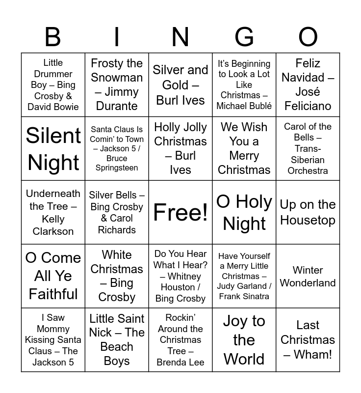 This bingo card has a free space and 48 words: All I Want for Christmas Is You – Mariah Carey, Last Christmas – Wham!, Jingle Bell Rock – Bobby Helms, Rockin’ Around the Christmas Tree – Brenda Lee, White Christmas – Bing Crosby, Let It Snow! Let It Snow! Let It Snow! – Dean Martin, Frosty the Snowman – Jimmy Durante, Jingle Bells, Silent Night, Rudolph the Red-Nosed Reindeer – Gene Autry, Santa Claus Is Comin’ to Town – Jackson 5 / Bruce Springsteen, It’s Beginning to Look a Lot Like Christmas – Michael Bublé, Winter Wonderland, Have Yourself a Merry Little Christmas – Judy Garland / Frank Sinatra, The Christmas Song (Chestnuts Roasting) – Nat King Cole, Blue Christmas – Elvis Presley, Holly Jolly Christmas – Burl Ives, O Holy Night, Sleigh Ride – The Ronettes, Feliz Navidad – José Feliciano, Silver Bells – Bing Crosby & Carol Richards, Joy to the World, Little Drummer Boy – Bing Crosby & David Bowie, We Wish You a Merry Christmas, The First Noel, Carol of the Bells – Trans-Siberian Orchestra, I Saw Mommy Kissing Santa Claus – The Jackson 5, Hark! The Herald Angels Sing, Do You Hear What I Hear? – Whitney Houston / Bing Crosby, O Come All Ye Faithful, Mary, Did You Know? – Pentatonix, Christmas (Baby Please Come Home) – Darlene Love, Deck the Halls, Mele Kalikimaka – Bing Crosby, Little Saint Nick – The Beach Boys, I’ll Be Home for Christmas – Bing Crosby, Here Comes Santa Claus – Gene Autry, Up on the Housetop, Grandma Got Run Over by a Reindeer – Elmo & Patsy, Run Rudolph Run – Chuck Berry, Believe – Josh Groban, Baby, It’s Cold Outside – Dean Martin, Silver and Gold – Burl Ives, Christmas Wrapping – The Waitresses, Underneath the Tree – Kelly Clarkson, Mistletoe – Justin Bieber, Christmas Time Is Here – Vince Guaraldi and It's the Most Wonderful Time of the Year – Andy Williams.