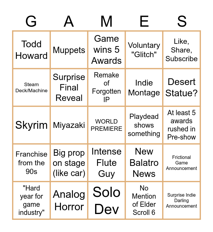 This bingo card has a free space and 81 words: Marvel Rivals, Geoff's Shoes, Game wins 5 Awards, Josef Fares, Audible Audience Yell, Random Celebrity On Stage, Silksong DLC, Hideo Kojima, A Mascot, Old School reboot, A new Farming game, Fortnite Collab, Voluntary "Glitch", Todd Howard, Quebec Studio, Steam Deck/Machine, New Valve Game, Big prop on stage (like car), Groundbreaking, At least 5 awards rushed in Pre-show, Influencer On Stage, Like, Share, Subscribe, Skyrim, Remake of Forgotten IP, Surprise Final Reveal, Genshin Impact, AAAA Game, No Mention of GTA6, Awkward smiles/stare at camera while waiting for video., Music Attempt to cut a speech, Desert Statue?, Videogame Movie Adaptation, Solo Dev, "you aint seen nothing yet", "Hard year for game industry", Playdead shows something, From Software Announcement, Mis-pronounced game name, Political Statement, AR Game, Surprise Indie Darling Announcement, Argument in the room about E33 beign indie, Show starts late, Spinoff of well known game, Miyazaki, VR Title, Muppets, Star Citizen Announcement, Surprise Game Release, Movie actor on stage, New Balatro News, Frictional Game Announcement, Wrong Number of Devs, Friend Slop, Obvious AI Art, Audience booing, Previous Winner On Stage, Trailer with no Gameplay, Unimpressed audience member, Cosplay in audience, Intense Flute Guy, X Year Anniversary of something, Geoff keighley welcomes a friend, Dev goes off script, New Extraction Shooter, 3 Anime Trailers in a row, Any ZA/UM Offspring, Wizards of the Coast, Netflix, Limited time deal, An animal, Franchise from the 90s, Analog Horror, New Publisher, Gatcha, Technology on Stage, AI Feature in a Game, No Mention of Elder Scroll 6, Remaster instead of Sequel, Indie Montage and 5 Trailers in a row without awards.