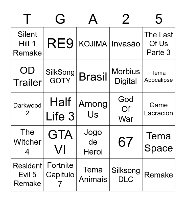 This bingo card has a free space and 24 words: GTA VI, Fortnite Capitulo 7, Brasil, Resident Evil 5 Remake, The Last Of Us Parte 3, Silent Hill 1 Remake, OD Trailer, RE9, God Of War, Jogo de Heroi, Morbius Digital, Darkwood 2, 67, Tema Space, SilkSong GOTY, Silksong DLC, Game Lacracion, KOJIMA, Tema Apocalipse, Half Life 3, Remake, The Witcher 4, Invasão and Tema Animais.