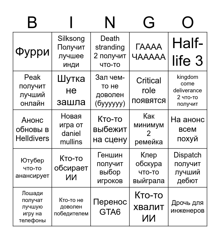 This bingo card has 25 words: Кто-то обсирает ИИ, Перенос GTA6, Зал чем-то не доволен (буууууу), Лошади получат лучшую игру на телефоны, Half-life 3, Фурри, Peak получит лучший онлайн, Silksong Получит лучшее инди, Как минимум 2 ремейка, Геншин получит выбор игроков, Critical role появятся, Анонс обновы в Helldivers, Клер обскура что-то выйграла, Dispatch получит лучший дебют, Шутка не зашла, Дрочь для инженеров, На анонс всем похуй, Death stranding 2 получит что-то, kingdom come deliverance 2 что-то получит, Новая игра от daniel mullins, Кто-то выбежит на сцену, Кто-то не доволен победителем, Ютубер что-то анансирует, ГАААА ЧААААА and Кто-то хвалит ИИ.