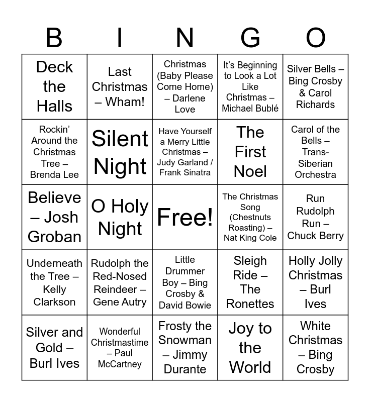 This bingo card has a free space and 50 words: All I Want for Christmas Is You – Mariah Carey, White Christmas – Bing Crosby, Let It Snow! Let It Snow! Let It Snow! – Dean Martin, Frosty the Snowman – Jimmy Durante, Rudolph the Red-Nosed Reindeer – Gene Autry, Santa Claus Is Comin’ to Town – Jackson 5 / Bruce Springsteen, Last Christmas – Wham!, Jingle Bell Rock – Bobby Helms, Rockin’ Around the Christmas Tree – Brenda Lee, Jingle Bells, Silent Night, It’s Beginning to Look a Lot Like Christmas – Michael Bublé, Holly Jolly Christmas – Burl Ives, Sleigh Ride – The Ronettes, Feliz Navidad – José Feliciano, Winter Wonderland, Have Yourself a Merry Little Christmas – Judy Garland / Frank Sinatra, The Christmas Song (Chestnuts Roasting) – Nat King Cole, Blue Christmas – Elvis Presley, Silver Bells – Bing Crosby & Carol Richards, O Holy Night, Joy to the World, Deck the Halls, The First Noel, Hark! The Herald Angels Sing, We Wish You a Merry Christmas, Carol of the Bells – Trans-Siberian Orchestra, Mary, Did You Know? – Pentatonix, Christmas (Baby Please Come Home) – Darlene Love, Little Drummer Boy – Bing Crosby & David Bowie, O Come All Ye Faithful, I Saw Mommy Kissing Santa Claus – The Jackson 5, Do You Hear What I Hear? – Whitney Houston / Bing Crosby, Happy Xmas (War Is Over) – John Lennon, Wonderful Christmastime – Paul McCartney, Mele Kalikimaka – Bing Crosby, I’ll Be Home for Christmas – Bing Crosby, Here Comes Santa Claus – Gene Autry, Up on the Housetop, Run Rudolph Run – Chuck Berry, Baby, It’s Cold Outside – Dean Martin, Christmas Wrapping – The Waitresses, Little Saint Nick – The Beach Boys, Grandma Got Run Over by a Reindeer – Elmo & Patsy, Silver and Gold – Burl Ives, Believe – Josh Groban, Christmas Time Is Here – Vince Guaraldi, It's the Most Wonderful Time of the Year – Andy Williams, Underneath the Tree – Kelly Clarkson and Mistletoe – Justin Bieber.