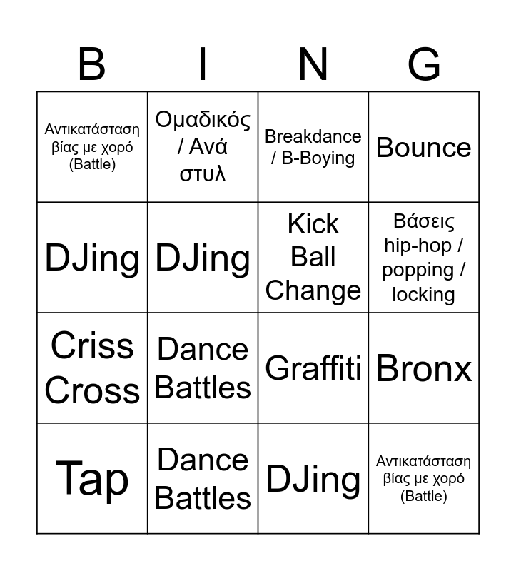 ⚠ This card has duplicate items: Bronx (3), Dance Battles (3), Ομαδικός / Ανά στυλ (3), Locking (3), Bounce (3), Criss Cross (3), Breakdance / B-Boying (3), Ball Change (3), DJing (3), Αντικατάσταση βίας με χορό (Battle) (3), Kick Ball Change (3), Βάσεις hip-hop / popping / locking (3), Tap (3), MCing / Ράπ (3), Popping (3), Graffiti (3)