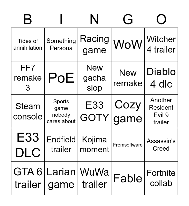 This bingo card has a free space and 24 words: Endfield trailer, Larian game, New gacha slop, GTA 6 trailer, Witcher 4 trailer, Tides of annihilation, FF7 remake 3, Something Persona, Cozy game, Kojima moment, New remake, Steam console, Fromsoftware, Assassin's Creed, PoE, Fable, Another Resident Evil 9 trailer, Racing game, Diablo 4 dlc, Sports game nobody cares about, Fortnite collab, E33 DLC, WoW and WuWa trailer.