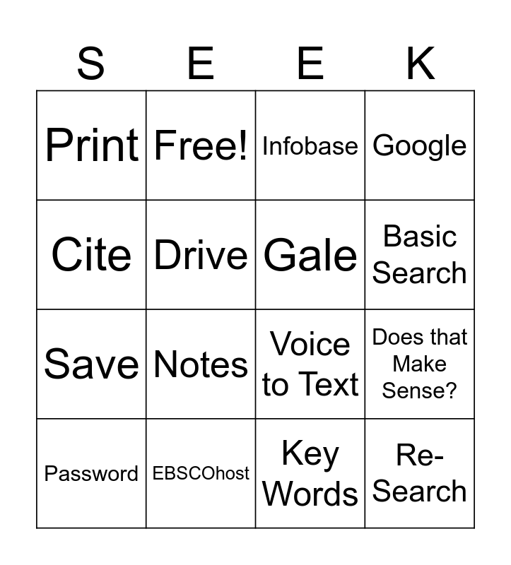 This bingo card has 32 words: Advanced Search, Not, Does that Make Sense?, Search Terms, Re-Search, Gale, Cite, Browse, Free!, Filters, Basic Search, Infobase, MLA, Highlight, EBSCOhost, And, Download, Voice to Text, Username, Research Log, Or, Citation, Key Words, Media Center, Password, Google, Save, Drive, Print, Link, Research and Notes.