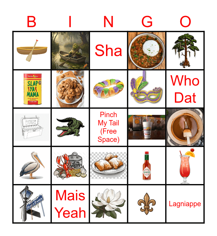 This bingo card has 20 images, a free space and 4 words: Mais Yeah, Sha, Who Dat and Lagniappe.