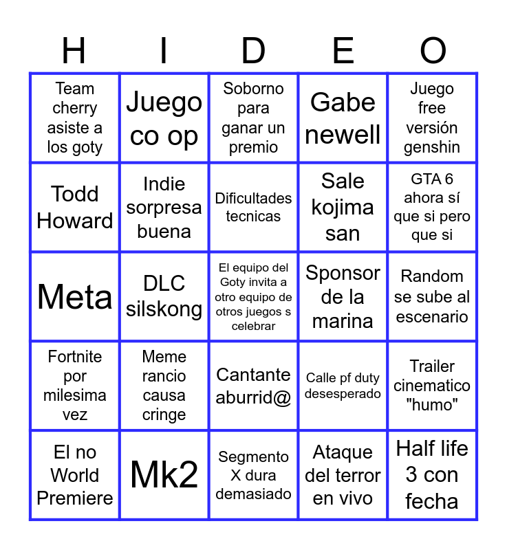 This bingo card has a free space and 24 words: Meme rancio causa cringe, Mk2, Dificultades tecnicas, El no World Premiere, Juego free versión genshin, Team cherry asiste a los goty, Todd Howard, Juego co op, Sponsor de la marina, Cantante aburrid@, Sale kojima san, Meta, Calle pf duty desesperado, Trailer cinematico "humo", Indie sorpresa buena, Ataque del terror en vivo, Random se sube al escenario, Soborno para ganar un premio, GTA 6 ahora sí que si pero que si, DLC silskong, Half life 3 con fecha, Fortnite por milesima vez, Gabe newell and Segmento X dura demasiado.