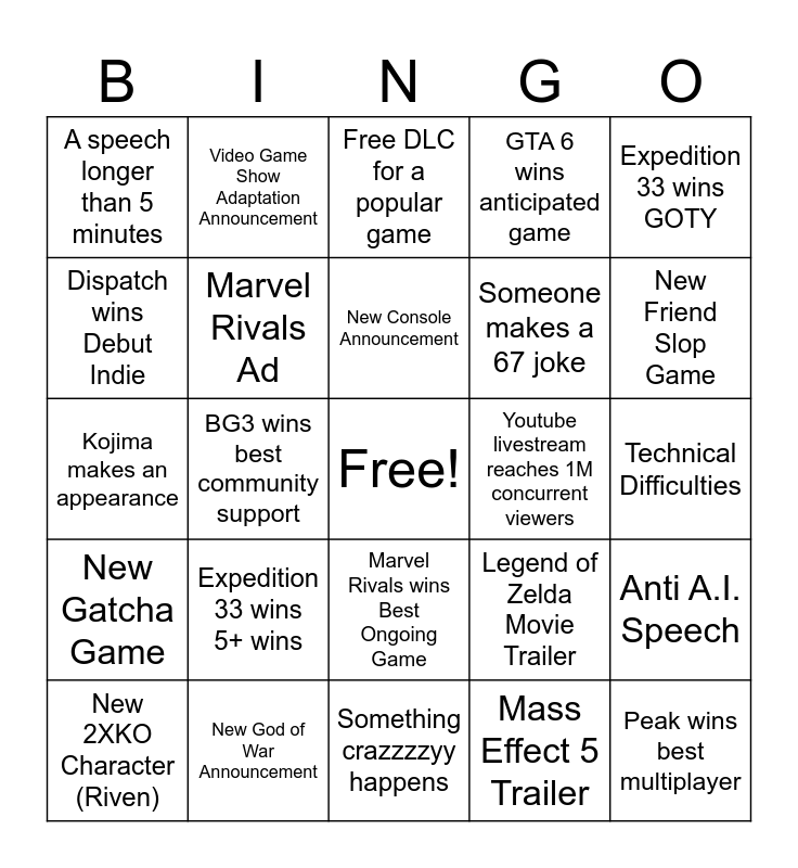 This bingo card has a free space and 24 words: Expedition 33 wins 5+ wins, New God of War Announcement, New Console Announcement, New 2XKO Character (Riven), Expedition 33 wins GOTY, A speech longer than 5 minutes, Dispatch wins Debut Indie, Video Game Show Adaptation Announcement, Youtube livestream reaches 1M concurrent viewers, Marvel Rivals wins Best Ongoing Game, Someone makes a 67 joke, Kojima makes an appearance, Legend of Zelda Movie Trailer, Anti A.I. Speech, Marvel Rivals Ad, Mass Effect 5 Trailer, Technical Difficulties, Free DLC for a popular game, New Friend Slop Game, BG3 wins best community support, Peak wins best multiplayer, New Gatcha Game, GTA 6 wins anticipated game and Something crazzzzyy happens.