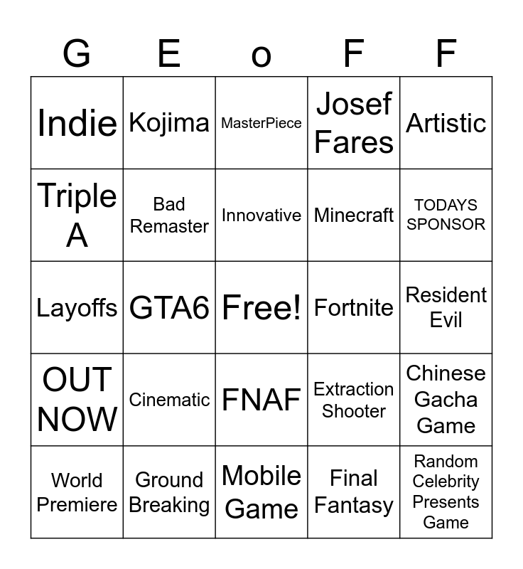 This bingo card has a free space and 24 words: Cinematic, Ground Breaking, Innovative, World Premiere, Artistic, Indie, Triple A, Kojima, Fortnite, FNAF, Minecraft, Layoffs, Extraction Shooter, Chinese Gacha Game, Bad Remaster, Final Fantasy, Resident Evil, MasterPiece, TODAYS SPONSOR, GTA6, Random Celebrity Presents Game, OUT NOW, Josef Fares and Mobile Game.