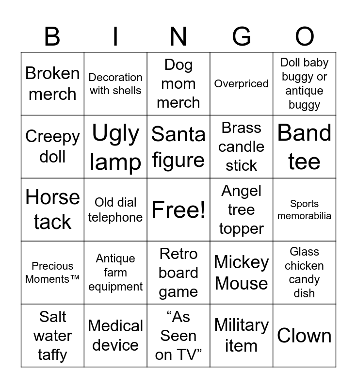 This bingo card has a free space and 49 words: Taxidermy, Clown, Titanic movie, “As Seen on TV”, Antique farm equipment, Quilt or afghan blanket, Decoration with shells, Geriatric device, Creepy doll, Beanie Baby™️, Ugly lamp, Overpriced, Glass chicken candy dish, Mickey Mouse, Vinyl record, Rubik’s Cube, Santa figure, Angel tree topper, Mug with a funny saying, Doll baby buggy or antique buggy, Old dial telephone, Military item, Broken merch, Brass candle stick, Blue & white China, Band tee, Salt water taffy, Animal fur, Retro board game, Precious Moments™️, Undergarment or diapers, Weapon, Belt buckle, Funky sunglasses, Medical device, Handcrafted furniture, 70's fashion, Wig, Sports memorabilia, Racially insensitive, Typewriter, Mattress, Mystery stain, Landscape Painting, Horse tack, Dog mom merch, Useless trinket, The largest garment you can find and Fez hat.