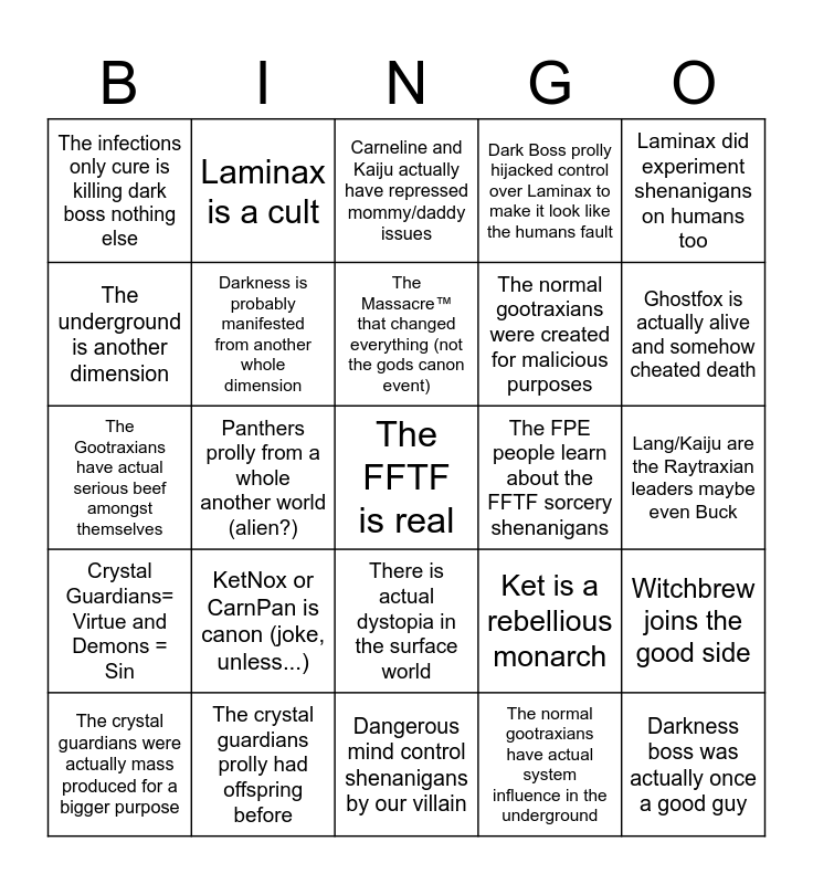 This bingo card has a free space and 24 words: KetNox or CarnPan is canon (joke, unless...), The crystal guardians prolly had offspring before, The Massacre™ that changed everything (not the gods canon event), The crystal guardians were actually mass produced for a bigger purpose, Laminax did experiment shenanigans on humans too, The infections only cure is killing dark boss nothing else, The underground is another dimension, Laminax is a cult, The FPE people learn about the FFTF sorcery shenanigans, There is actual dystopia in the surface world, The normal gootraxians were created for malicious purposes, The Gootraxians have actual serious beef amongst themselves, Ket is a rebellious monarch, Witchbrew joins the good side, Darkness is probably manifested from another whole dimension, The normal gootraxians have actual system influence in the underground, Lang/Kaiju are the Raytraxian leaders maybe even Buck, Carneline and Kaiju actually have repressed mommy/daddy issues, Ghostfox is actually alive and somehow cheated death, Panthers prolly from a whole another world (alien?), Darkness boss was actually once a good guy, Crystal Guardians= Virtue and Demons = Sin, Dark Boss prolly hijacked control over Laminax to make it look like the humans fault and Dangerous mind control shenanigans by our villain.