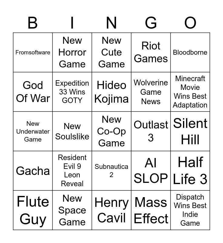 This bingo card has a free space and 24 words: Resident Evil 9 Leon Reveal, New Space Game, Hideo Kojima, Flute Guy, Bloodborne, Fromsoftware, God Of War, New Horror Game, Outlast 3, Subnautica 2, Wolverine Game News, New Underwater Game, AI SLOP, Half Life 3, Expedition 33 Wins GOTY, Mass Effect, Silent Hill, New Cute Game, Minecraft Movie Wins Best Adaptation, New Soulslike, Dispatch Wins Best Indie Game, Gacha, Riot Games and Henry Cavil.