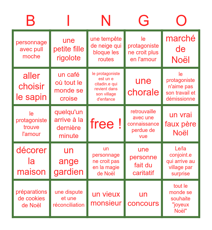 This bingo card has a free space and 24 words: préparations de cookies de Noël, un ange gardien, le protagoniste est un e citadin.e qui revient dans son village d'enfance, un concours, marché de Noël, personnage avec pull moche, une petite fille rigolote, une tempête de neige qui bloque les routes, retrouvaille avec une connaissance perdue de vue, un vrai faux père Noël, le protagoniste trouve l'amour, un café où tout le monde se croise, une personne fait du caritatif, Le/la conjoint.e qui arrive au village par surprise, aller choisir le sapin, une dispute et une réconciliation, un vieux monsieur, le protagoniste ne croit plus en l'amour, le protagoniste n'aime pas son travail et démissionne, décorer la maison, quelqu'un arrive à la dernière minute, un personnage ne croit pas en la magie de Noël, une chorale and tout le monde se souhaite "joyeux Noël".