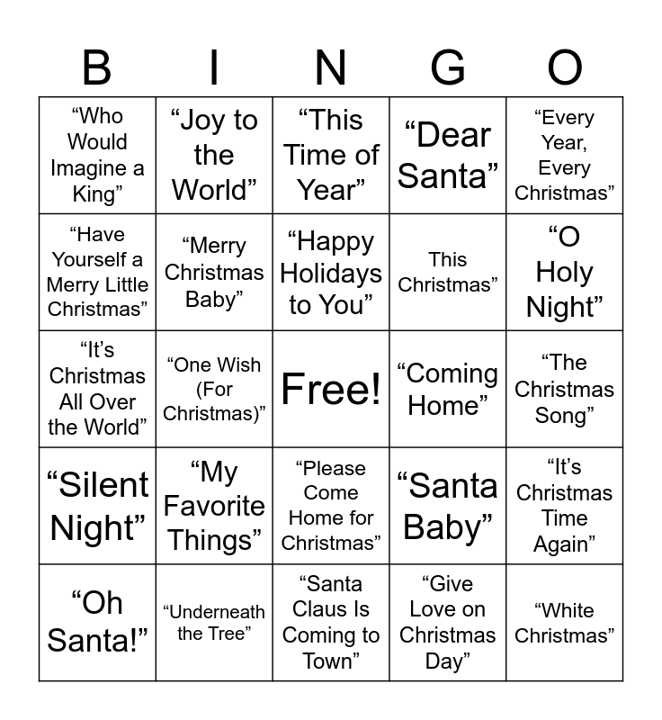 This bingo card has a free space and 42 words: “What Do the Lonely Do at Christmas”, “Happy Holidays to You”, “All I Want for Christmas Is You”, “My Favorite Things”, “Give Love on Christmas Day”, “It’s Christmas Time Again”, “White Christmas”, “Love on Christmas”, “This Time of Year”, “Please Come Home for Christmas”, “The Christmas Song”, “O Holy Night”, “One Wish (For Christmas)”, “Every Year, Every Christmas”, “Merry Christmas Baby”, “Santa Baby”, “Grown-Up Christmas List”, “It’s Christmas All Over the World”, “I Saw Mommy Kissing Santa Claus”, “Joy to the World”, “Have Yourself a Merry Little Christmas”, “All I Want Is You (This Christmas)”, “I Want to Come Home for Christmas”, “Who Would Imagine a King”, “I’ll Be Home for Christmas”, “8 Days of Christmas”, This Christmas”, “Give Love on Christmas Day”, “Someday at Christmas”, “What Christmas Means to Me”, “Let It Snow”, “Silent Night”, “Merry Christmas Baby”, “Santa Claus Is Coming to Town”, “Christmas Time Is Here”, “Oh Santa!”, “Underneath the Tree”, “Coming Home”, “This Christmas” – Chris Brown (cover), “It’s Christmas”, “Dear Santa” and “Christmas Eve”.