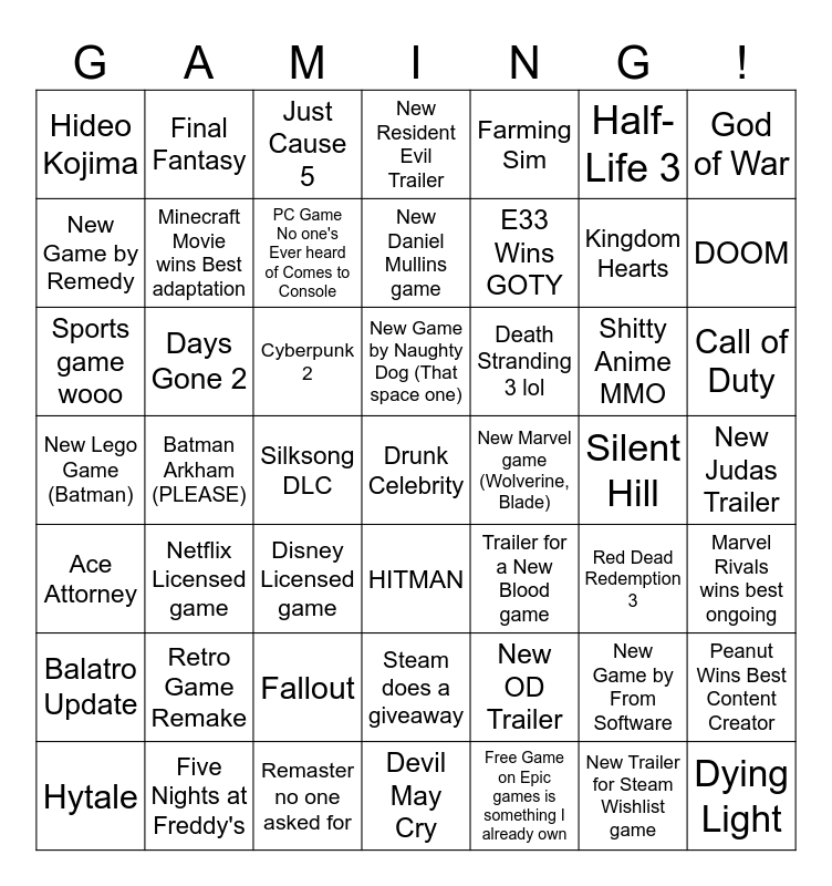 This bingo card has a free space and 48 words: New OD Trailer, Kingdom Hearts, Devil May Cry, Batman Arkham (PLEASE), Cyberpunk 2, New Judas Trailer, Final Fantasy, Five Nights at Freddy's, Half-Life 3, HITMAN, God of War, New Resident Evil Trailer, Shitty Anime MMO, Death Stranding 3 lol, Balatro Update, Silent Hill, New Game by Remedy, DOOM, New Game by From Software, Farming Sim, E33 Wins GOTY, Silksong DLC, Hideo Kojima, Minecraft Movie wins Best adaptation, Peanut Wins Best Content Creator, PC Game No one's Ever heard of Comes to Console, Call of Duty, Hytale, New Game by Naughty Dog (That space one), Days Gone 2, New Trailer for Steam Wishlist game, New Marvel game (Wolverine, Blade), Marvel Rivals wins best ongoing, Retro Game Remake, New Lego Game (Batman), Trailer for a New Blood game, Red Dead Redemption 3, Sports game wooo, Disney Licensed game, Fallout, Ace Attorney, Dying Light, Just Cause 5, Remaster no one asked for, New Daniel Mullins game, Steam does a giveaway, Netflix Licensed game and Free Game on Epic games is something I already own.