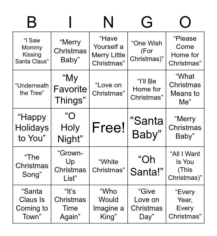 This bingo card has a free space and 41 words: “What Do the Lonely Do at Christmas”, “Happy Holidays to You”, “All I Want for Christmas Is You”, “My Favorite Things”, “It’s Christmas Time Again”, “White Christmas”, “Love on Christmas”, “This Time of Year”, “Please Come Home for Christmas”, “The Christmas Song”, “O Holy Night”, “One Wish (For Christmas)”, “Every Year, Every Christmas”, “Merry Christmas Baby”, “Santa Baby”, “Grown-Up Christmas List”, “It’s Christmas All Over the World”, “I Saw Mommy Kissing Santa Claus”, “Joy to the World”, “Have Yourself a Merry Little Christmas”, “All I Want Is You (This Christmas)”, “I Want to Come Home for Christmas”, “Who Would Imagine a King”, “I’ll Be Home for Christmas”, “8 Days of Christmas”, This Christmas”, “Give Love on Christmas Day”, “Someday at Christmas”, “What Christmas Means to Me”, “Let It Snow”, “Silent Night”, “Merry Christmas Baby”, “Santa Claus Is Coming to Town”, “Christmas Time Is Here”, “Oh Santa!”, “Underneath the Tree”, “Coming Home”, “This Christmas” – Chris Brown (cover), “It’s Christmas”, “Dear Santa” and “Christmas Eve”.