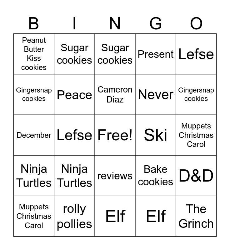 ⚠ This card has duplicate items: Cameron Diaz (3), Santa (3), Elf (3), A Christmas Story (3), Home Alone (3), The Grinch (3), National Lampoon’s Christmas Vacation (3), Muppets Christmas Carol (3), Four Christmases (3), A Bad Mom's Christmas (3), Thanksgiving (3), Halloween (3), December (3), Never (3), Jelly cookies (3), Lefse (3), Sugar cookies (3), Eggnog (3), Peanut Butter Kiss cookies (3), Gingersnap cookies (3), Christmas lights (3), Bake cookies (3), Ravioli (3), Bourgeoisie (3), Ninja Turtles (3), Peace (3), Ski (3), D&D (3), Present (3), Books (3)