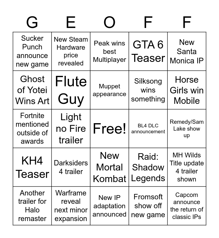 This bingo card has a free space and 61 words: RGG show off SiP, Warframe reveal next minor expansion, Elder Scrolls 6 update, KH4 Teaser, Fromsoft show off new game, Larian Studios reveal new game, Flute Guy, E33 Sweep (Most categories its nominated for), Silksong wins something, FF7 p3 Teaser, GTA 6 Teaser, Bethesda reveal, Ghost of Yotei Wins Art, DMC Wins Adaptation, DMC Loses adaptation to the Last of Us, Sucker Punch announce new game, Capcom announce the return of classic IPs, New Santa Monica IP, Layoffs mentioned, Muppet appearance, BL4 DLC announcement, Peak wins best Multiplayer, Another trailer for Halo remaster, MH Wilds Title update 4 trailer shown, Doom the Dark Ages wins best accessibility, South of Midnight wins Impact, Rivals wins best ongoing, No Man Sky with best support... again, Horse Girls win Mobile, 2XKO wins fighting game, Sonic beats Mario in Racing category, Someone mentions AI being used in games, Burnt Peanut wins Content creator, New Genshin style game revealed, New Steam Hardware price revealed, PS tease new console, DMC season 2 reveal, Light no Fire trailer, Zelda Movie trailer, Fortnite mentioned outside of awards, Dev team that has not released in ages announcing a new game, Darksiders 4 trailer, Remedy/Sam Lake show up, Sea of Remnants release Date reveal, Raid: Shadow Legends, God of War, Another Xbox staple to come to PS, Marvel Tokon Release date, P4R release date, New Mortal Kombat, New IP adaptation announced, RE9 Leon Trailer, RE5 Remake, Witcher 4 trailer, Geoff glazes Kojima, Unexpected Celebrity shows up, Wolverine Game trailer/update, Sly Cooper, Infamous, Prototype and Splinter Cell.