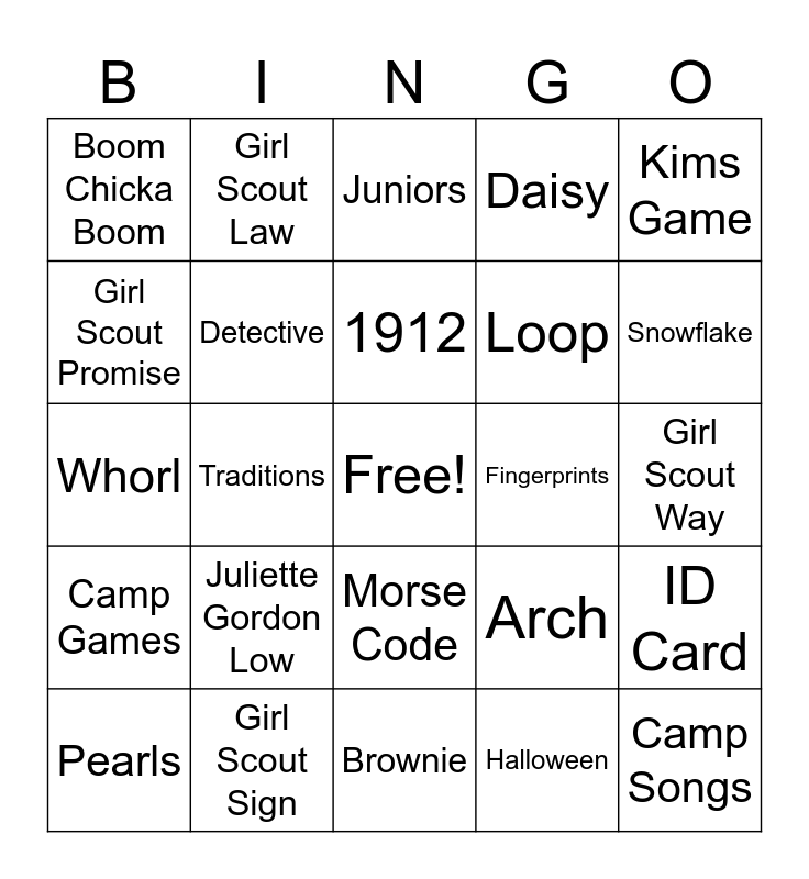 This bingo card has a free space and 24 words: Juliette Gordon Low, Girl Scout Sign, 1912, Pearls, Kims Game, Boom Chicka Boom, Girl Scout Promise, Girl Scout Law, Fingerprints, Morse Code, Loop, Whorl, Arch, ID Card, Detective, Halloween, Girl Scout Way, Juniors, Snowflake, Traditions, Camp Songs, Camp Games, Daisy and Brownie.