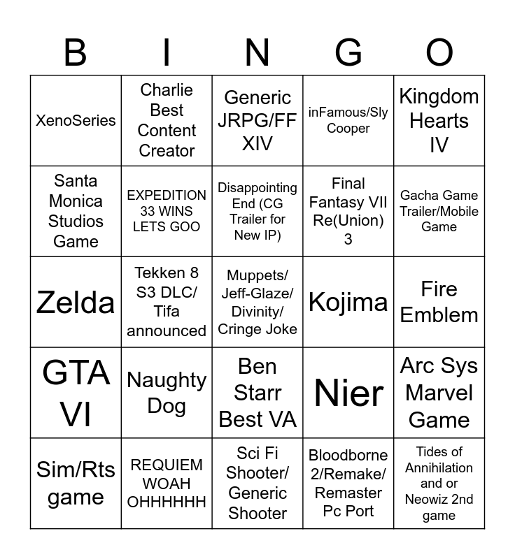 This bingo card has a free space and 24 words: Naughty Dog, REQUIEM WOAH OHHHHHH, Disappointing End (CG Trailer for New IP), Sim/Rts game, Kingdom Hearts IV, XenoSeries, Santa Monica Studios Game, Charlie Best Content Creator, Kojima, Ben Starr Best VA, Final Fantasy VII Re(Union) 3, Zelda, Nier, Arc Sys Marvel Game, EXPEDITION 33 WINS LETS GOO, Bloodborne 2/Remake/ Remaster Pc Port, Fire Emblem, Generic JRPG/FF XIV, Gacha Game Trailer/Mobile Game, Tekken 8 S3 DLC/ Tifa announced, Tides of Annihilation and or Neowiz 2nd game, GTA VI, inFamous/Sly Cooper and Sci Fi Shooter/ Generic Shooter.
