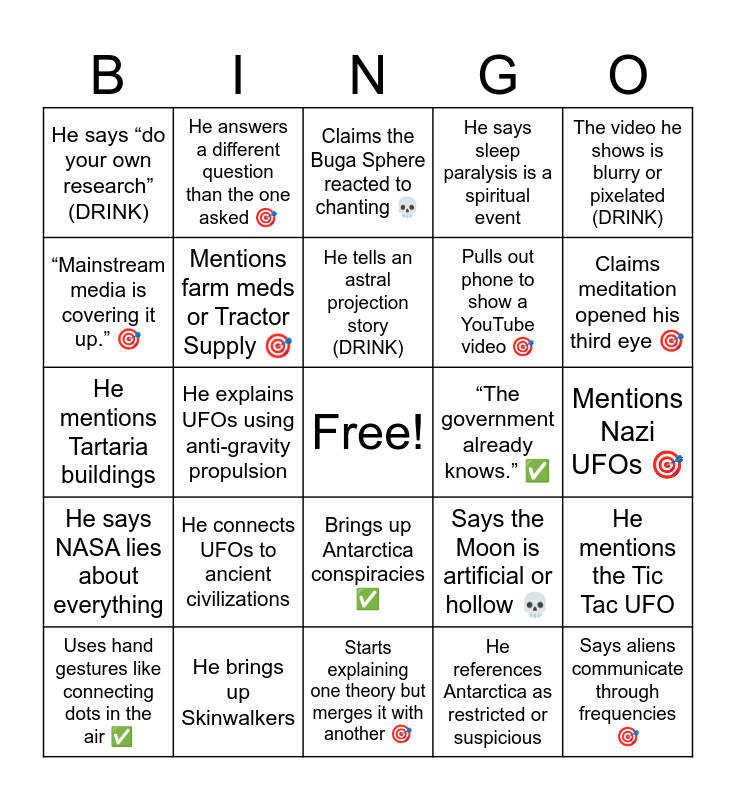 This bingo card has a free space and 126 words: Roberto mentions ivermectin curing cancer, Roberto brings up parasites causing disease, He references farm medications or Tractor Supply, He says the Buga Sphere has “no seams”, He says the Buga Sphere responded to chanting (DRINK), He claims the sphere gained weight, He says NASA lies about everything, He mentions the firmament, He references Antarctica as restricted or suspicious, He says the Moon isn’t natural, He brings up 20-and-Back memory wiping, He mentions anti-gravity tech exists, He says alien documents are blurry on purpose, He mentions reptilians or shapeshifters (SHOT), He points out someone’s blink as “evidence”, He says Dogman sightings are real, He brings up Skinwalkers, He says Bigfoot goes interdimensional, He compares cryptids to aliens, He mentions Fresno Nightcrawlers, He says pyramids were energy generators, He mentions Tartaria buildings, He references 432 Hz or 528 Hz, He claims sound healing works, He says meditation opened his third eye, He tells an astral projection story (DRINK), He says sleep paralysis is a spiritual event, He claims remote viewing is proven, Roberto says UFOs are definitely real, He says the government recovered crashed UFOs (SHOT), He mentions the Tic Tac UFO, He says aliens communicate with frequencies, He explains UFOs using anti-gravity propulsion, He connects UFOs to ancient civilizations, He ties UFOs into his reptilian theory, He brings up flat Earth, He mentions the ice wall, He claims eclipses don’t make sense on a globe, He says “everything is connected” (DRINK), He says “they don’t want you to know”, He says “do your own research” (DRINK), He raises his voice while explaining, He uses both hands to gesture wildly, He interrupts himself with another theory, He connects two unrelated theories into one, He starts drawing a diagram, He pulls out his phone to show a video (SHOT), The video he shows is blurry or pixelated (DRINK), He quotes someone with no scientific background, He says “hear me out”, He ends a rant with “you’ll see…” (SHOT), Someone asks “Bro, what?”, Someone laughs before he finishes, Someone says “Oh my god, Roberto”, Someone has to drink because the energy is too much (DRINK), “You have to wake up, man.” ✅, “Do your own research.” 🎯, “They don’t want you to know the truth.” 🎯, “It’s all connected.” ✅, “The government already knows.” ✅, “Mainstream media is covering it up.” 🎯, “Follow the money.” ✅, “Look at the ancient texts.” ✅, “There’s more to this than they’re telling us.” 🎯, “They’ve been hiding this for years.” 🎯, “History has been rewritten.” ✅, Mentions Lizard People controlling the government 💀, Brings up Antarctica conspiracies ✅, Says Bigfoot is interdimensional 🎯, Mentions Nazi UFOs 🎯, References Above Majestic 💀, Says aliens built the pyramids ✅, Thinks Elon Musk is “in on it” 🎯, Brings up Area 51 or underground bases 🎯, Thinks Tesla (the scientist) was silenced 🎯, Brings up JFK assassination conspiracy 🎯, Talks about Skinwalker Ranch 🎯, Believes the Moon landing was faked 🎯, Thinks the government has time travel tech 💀, Mentions “the simulation” or the Matrix 🎯, Brings up Tartaria or mud floods 🎯, Gets frustrated when someone challenges him ✅, Leans in and lowers his voice like he’s revealing something dangerous 💀, Checks over his shoulder before saying something “classified” 💀, Uses hand gestures like connecting dots in the air ✅, Says, “I can’t say too much about this, but…” 🎯, Mentions having “sources” but doesn’t specify who 🎯, Tries to explain something, pauses, then says, “Never mind, it’s too deep.” ✅, Starts explaining one theory but merges it with another 🎯, Says, “You’ll see. Just wait.” 💀, Looks at the bartender suspiciously ✅, Says ivermectin cures more than doctors admit 🎯, Mentions parasites being the root of most disease 🎯, Mentions farm meds or Tractor Supply 🎯, Says the Buga Sphere has no seams or welds 🎯, Claims the Buga Sphere reacted to chanting 💀, Says the sphere “gained weight over time” 🎯, Says UFO sightings are increasing because disclosure is near 🎯, Mentions the Tic Tac UFOs 🎯, Claims the government recovered crashed UFOs 💀, Says aliens communicate through frequencies 🎯, Thinks UFOs helped ancient civilizations 🎯, Says the Moon is artificial or hollow 💀, Says anti-gravity tech already exists 🎯, Connects reptilians to aliens 🎯, Brings up Dogman or Skinwalkers as interdimensional 🎯, Mentions Fresno Nightcrawlers like it's established fact 🎯, References 432 Hz or 528 Hz 🎯, Claims meditation opened his third eye 🎯, Mentions an astral projection experience 💀, Says sleep paralysis is a spiritual encounter 🎯, Says remote viewing is proven 🎯, Talks about flat Earth horizon arguments 🎯, Mentions the ice wall 🎯, Says eclipses don’t work on a globe 💀, Says seasons prove Earth is flat 🎯, Says “NASA edits all their photos” 🎯, Mentions gold/silver being the only real money 🎯, Mentions dollar collapse or BRICS 🎯, Connections two unrelated theories with “Think about it…” 🎯, Pulls out phone to show a YouTube video 🎯, The video he shows is extremely blurry 🎯, He starts talking faster mid-rant 🎯, He gets louder as he goes 🎯, He answers a different question than the one asked 🎯 and Says “Hear me out…” 🎯.