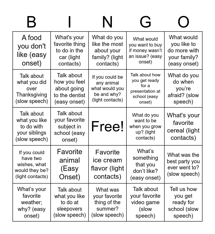 This bingo card has a free space and 24 words: Favorite animal (Easy Onset), Talk about what you like to do at sleepovers (slow speech), If you could be any animal what would you be and why? (light contacts), What’s your favorite weather; why? (easy onset), What would you like to do more with your family? (easy onset), A food you don't like (easy onset), Talk about what you did over Thanksgiving (slow speech), What's your favorite thing to do in the car (light contacts), What do you want to be when you grow up? (light contacts), Favorite ice cream flavor (light contacts), Talk about how you get ready for a presentation at school (easy onset), Talk about what you like to do with your siblings (slow speech), What’s something that you don’t like? (easy onset), What was the best party you ever went to? (slow speech), Talk about how you feel about going to the dentist (easy onset), Talk about your favorite video game (slow speech), What's your favorite cereal (light contacts), What do you like the most about your family? (light contacts), What do you do when you’re afraid? (slow speech), Talk about your favorite subject in school (easy onset), Tell us how you get ready for school (slow speech), If you could have two wishes, what would they be? (light contacts), What would you want to buy if money wasn’t an issue? (easy onset) and What was your favorite thing of the summer? (slow speech).