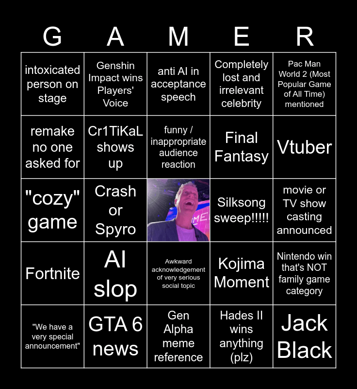 This bingo card has a free space and 24 words: AI slop, GTA 6 news, funny / inappropriate audience reaction, "We have a very special announcement", Pac Man World 2 (Most Popular Game of All Time) mentioned, intoxicated person on stage, remake no one asked for, Genshin Impact wins Players' Voice, Silksong sweep!!!!!, Awkward acknowledgement of very serious social topic, Final Fantasy, "cozy" game, Kojima Moment, Nintendo win that's NOT family game category, Cr1TiKaL shows up, Hades II wins anything (plz), movie or TV show casting announced, anti AI in acceptance speech, Vtuber, Crash or Spyro, Jack Black, Fortnite, Completely lost and irrelevant celebrity and Gen Alpha meme reference.