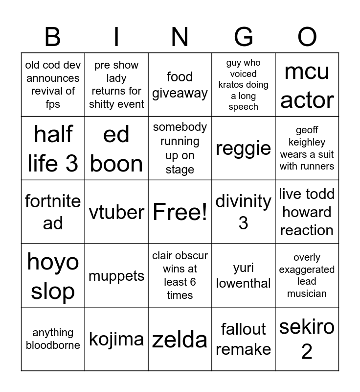This bingo card has a free space and 24 words: muppets, kojima, somebody running up on stage, anything bloodborne, mcu actor, old cod dev announces revival of fps, half life 3, pre show lady returns for shitty event, divinity 3, clair obscur wins at least 6 times, reggie, fortnite ad, yuri lowenthal, overly exaggerated lead musician, ed boon, fallout remake, live todd howard reaction, food giveaway, geoff keighley wears a suit with runners, vtuber, sekiro 2, hoyo slop, guy who voiced kratos doing a long speech and zelda.