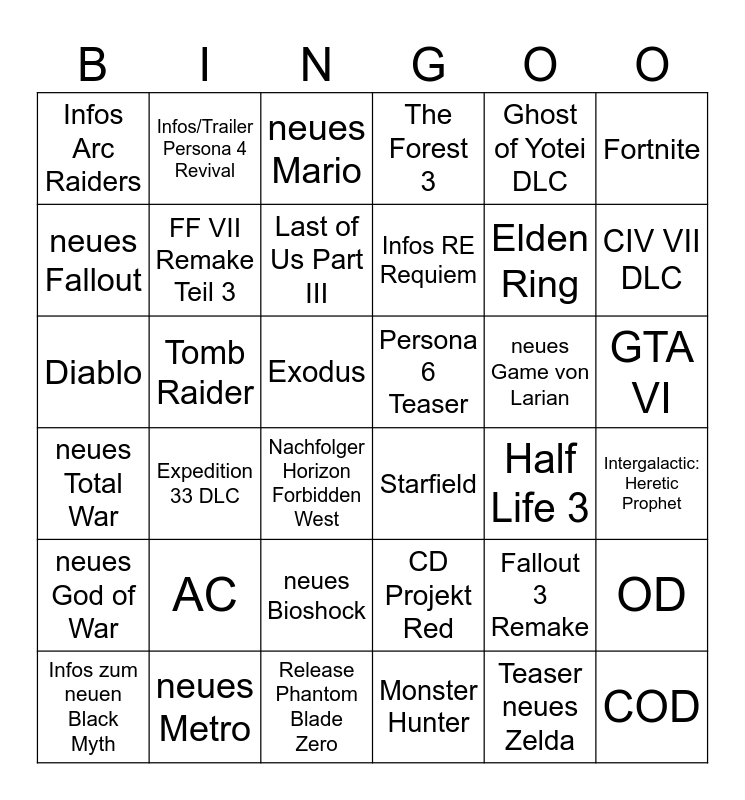 This bingo card has 36 words: CD Projekt Red, neues Bioshock, Monster Hunter, neues Fallout, neues Total War, Persona 6 Teaser, FF VII Remake Teil 3, Release Phantom Blade Zero, Ghost of Yotei DLC, Fallout 3 Remake, CIV VII DLC, The Forest 3, OD, Tomb Raider, Infos RE Requiem, Infos Arc Raiders, neues God of War, neues Game von Larian, Diablo, neues Mario, Exodus, Expedition 33 DLC, Starfield, Nachfolger Horizon Forbidden West, Half Life 3, Infos/Trailer Persona 4 Revival, Elden Ring, neues Metro, Last of Us Part III, Fortnite, COD, Infos zum neuen Black Myth, Intergalactic: Heretic Prophet, GTA VI, AC and Teaser neues Zelda.
