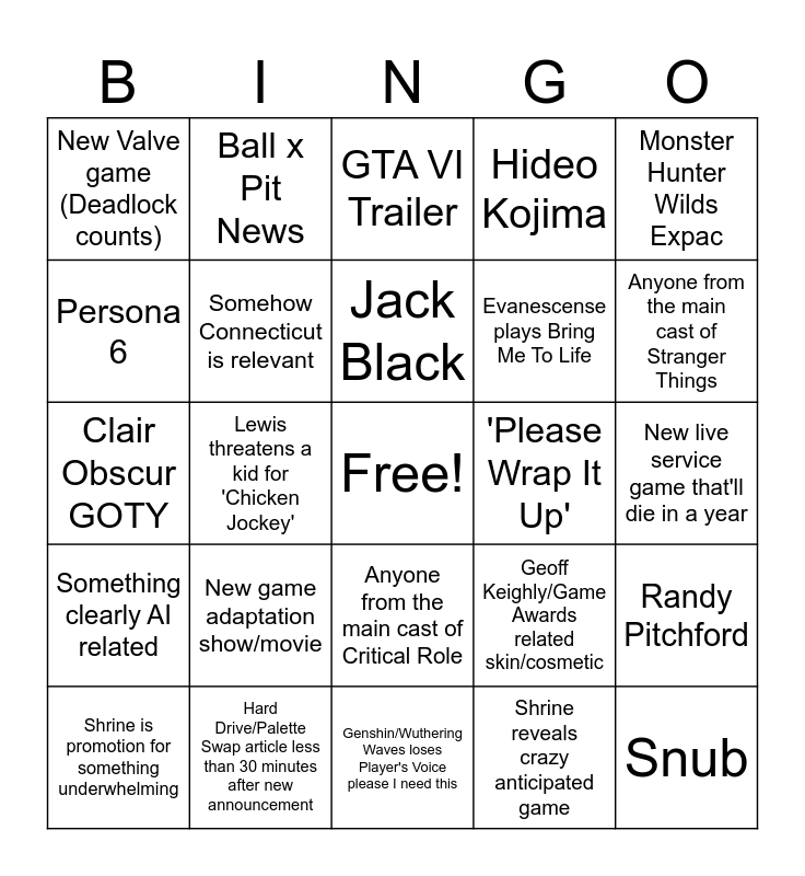 This bingo card has a free space and 39 words: Lewis buys a game mid Game Awards, Xbox Game wins Anything (unlikely), Witcher IV News, Somehow Connecticut is relevant, Shrine is promotion for something underwhelming, Anyone from the main cast of Critical Role, Jack Black, Reggie, Monster Hunter Wilds Expac, Something clearly AI related, Lewis threatens a kid for 'Chicken Jockey', Hideo Kojima, Snub, New live service game that'll die in a year, 'Please Wrap It Up', New game adaptation show/movie, New game that only Manny cares about, New Valve game (Deadlock counts), Technical difficulties, Geoff Keighly/Game Awards related skin/cosmetic, Persona 6, Genshin/Wuthering Waves loses Player's Voice please I need this, Evanescense plays Bring Me To Life, Anyone from the main cast of Stranger Things, Indiana Jones Wins Anything, Matan Even, Bloodborne Remaster, Balatro 1.1 news, No E33 GOTY, Ball x Pit News, Someone speaks for way longer than necessary, Jacob is not indifferent, GTA VI Trailer, Hard Drive/Palette Swap article less than 30 minutes after new announcement, Shrine reveals crazy anticipated game, Trailer that tells us nothing, Randy Pitchford, Clair Obscur GOTY and Charlie crashout.