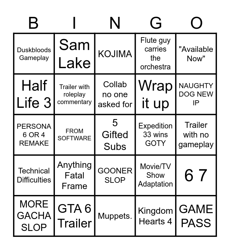 This bingo card has a free space and 24 words: Anything Fatal Frame, GTA 6 Trailer, Collab no one asked for, MORE GACHA SLOP, "Available Now", Duskbloods Gameplay, Half Life 3, Sam Lake, Expedition 33 wins GOTY, GOONER SLOP, Wrap it up, PERSONA 6 OR 4 REMAKE, Movie/TV Show Adaptation, 6 7, Trailer with roleplay commentary, Kingdom Hearts 4, Trailer with no gameplay, KOJIMA, NAUGHTY DOG NEW IP, FROM SOFTWARE, GAME PASS, Technical Difficulties, Flute guy carries the orchestra and Muppets..