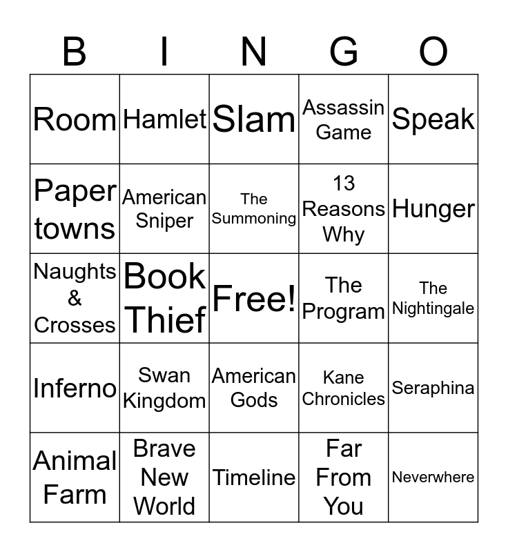 This bingo card has a free space and 24 words: Swan Kingdom, Brave New World, The Summoning, Animal Farm, Speak, Room, Paper towns, Hamlet, The Program, American Gods, 13 Reasons Why, Naughts & Crosses, Kane Chronicles, Seraphina, American Sniper, Far From You, The Nightingale, Slam, Hunger, Book Thief, Neverwhere, Inferno, Assassin Game and Timeline.